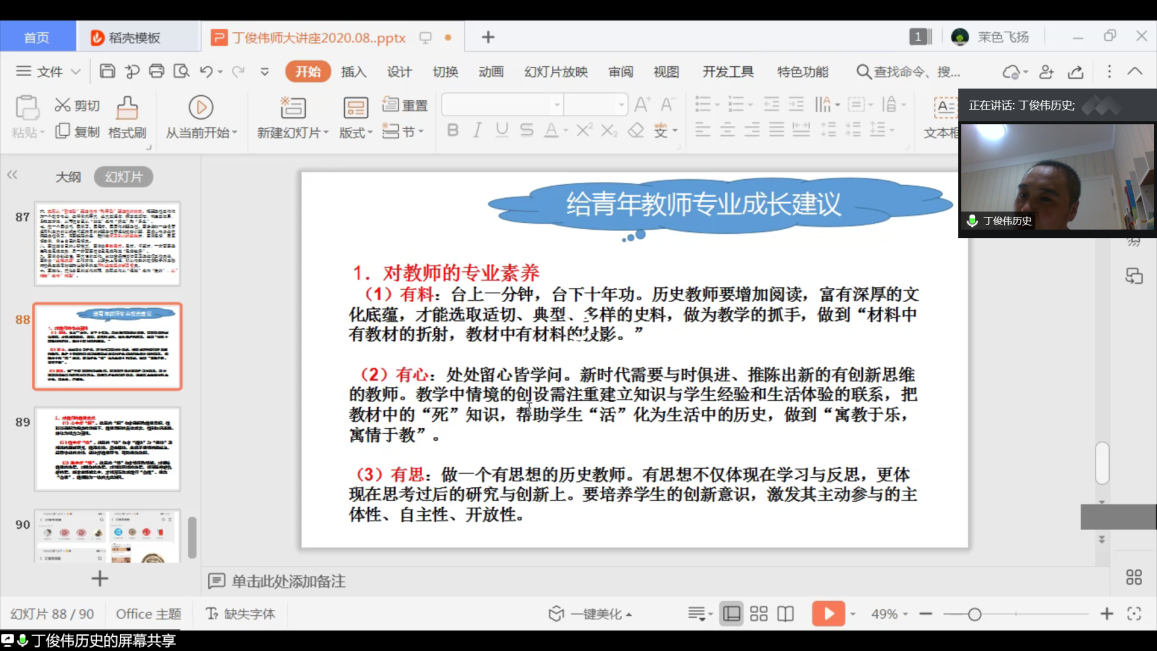 接着,丁老师通过优秀教学案例的讲解和对比,强调教师的教学讲解必须符合历史环境,要多借鉴别人的优秀的成果,掌握丰富的史料并运用于教学,在教学过程中保持严谨的研学态度,强调跨学科整合,培养学生看、学、操作等多方面能力,调动学生的学习积极性。他认为一节课最好PPT在17页左右,这样更适合学生学习和教学时间的需要。