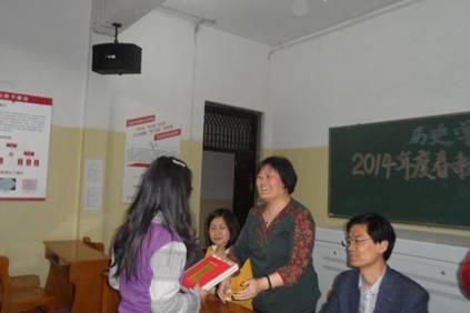 首先,同学们对老师的到来报以热烈掌声,感谢了小组指导教师对读书会付出的辛勤劳动和坚定支持。接着,赠书仪式开始,王泽壮宣读获得赠书和荣誉表彰的同学名单,李万中书记、车效梅院长、张焕君副院长、双春梅副书记分别颁发了“特殊贡献奖”、“突出贡献奖”、“最佳风采奖”、“最佳组织奖”和“表现优异奖”五个奖项,以书代奖,或荣誉表彰,进一步突出了读书会的宗旨,提醒同学们广博群书。最后,张焕君副院长作了总结发言,他强调,读书是以兴趣为基准的,读书会为同学们提供了这样一个平台,所以,希望同学们多读书,扩充视野,增长见识。前任读书会总召集人李媛也对新一届读书会骨干队伍作出寄语,希望大家一直支持读书会,使读书会越办越好。最后,颁奖领导和老师与全体获得奖励的成员合影留念。