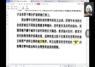 在本次读书会中,老师主要概括讲解了第七章第一节地域社会的新变化,依然采用共享屏幕的方式带领大家阅读,并且借助PDF的批注、标记工具来分析和勾画重点,梳理了第一节的整体脉络。老师特意针对日语中的汉语词汇做了概念的辨析,如“地域社会”、“劳动组合”、“小作争议”等,帮助我们理解文本内容。
