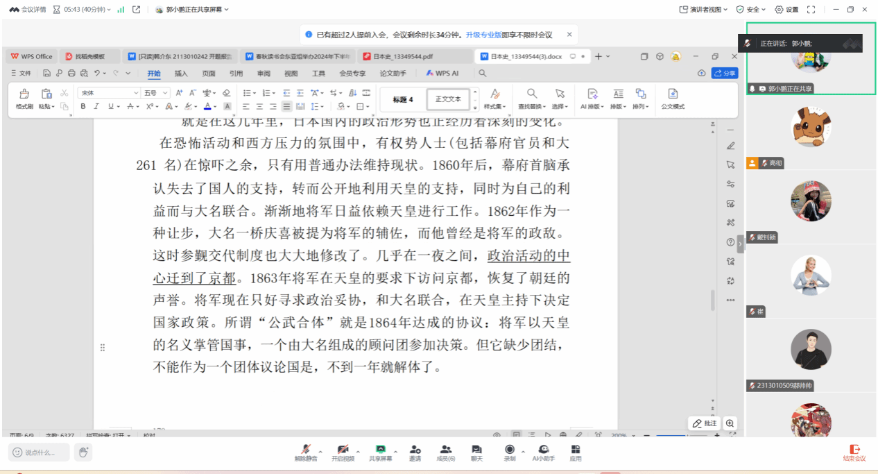 2025年3月1日19:00,新葡的京集团8814春秋读书会东亚组在郭小鹏老师的带领下于腾讯会议开展了2025年上半年第一次读书活动。本次读书会的主要内容是《日本史》第十二章日本的开放和德川制度的终结,本篇主要讨论了19世纪日本在应对西方压力下做出的一系列改革和结果。