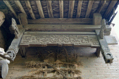 这家的建筑风格很有特点,院内院外都有照壁,大门上有古老的木雕造型,还有牌匾,是一个四合院。院外的石磨不见了上面的滚石,只有磨盘孤孤地躺在那。(图9)大门顶上的木雕无言地诉说着古老的历史,木雕下面是拍草,据村民讲,门上贴拍草是一种很古老的民俗:在门上贴拍草代表家里生了孩子,有根的生的是男孩,没有的生的是女孩。(图10)