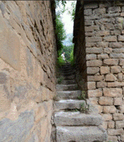 通往上一层建筑的台阶小路,和民居一样,都是石头砌就的,很多台阶都已经磨成了枕头型,穿过这窄窄的台阶,仿佛完成了千年历史的穿越。(图11)上面这一层的院子建筑不是窑洞,而是石房子了。(图12)