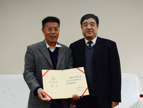 4月14日下午,校领导卫建国、郝勇东、车文明在学术交流中心接待室会见了中国人民大学李世安教授。院党委书记双春梅、院长车效梅、副院长张焕君一同参加了会见。会上,卫建国校长代表学校向李世安教授颁发了我校特聘教授证书。