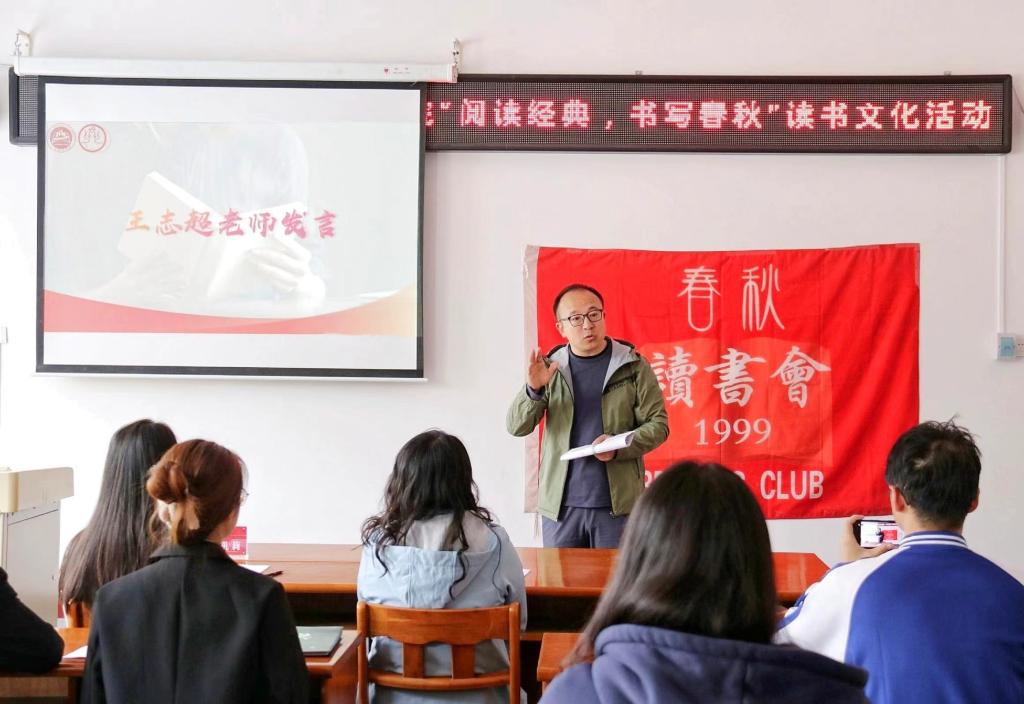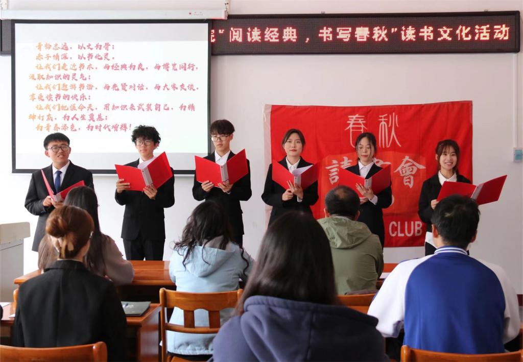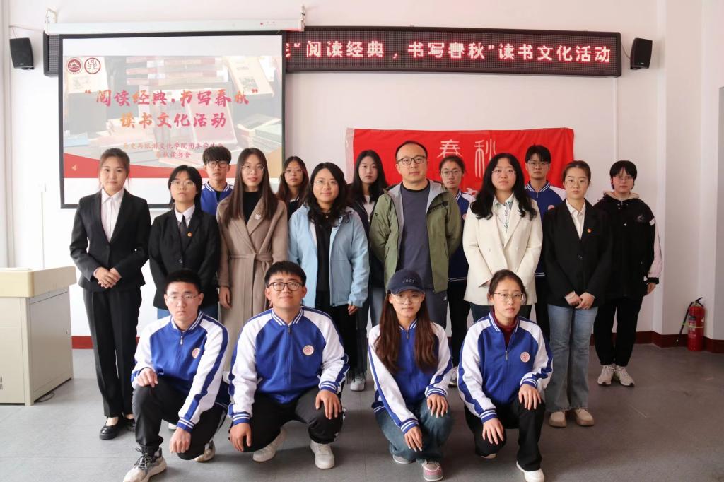 春风拂煦来,读书正当时。为倡导爱读书、读好书的文化风气,培养学生读书习惯,激发学生阅读兴趣,4月22日上午10时,我院于南区一号楼二层会议室开展了“阅读经典,书写春秋”读书文化活动。院党委副书记郝艳红、春秋读书会指导教师王志超、院团委负责人代凯莉、团委学生会主席团成员和大一各班代表线下参与,其余同学线上观看微博直播。