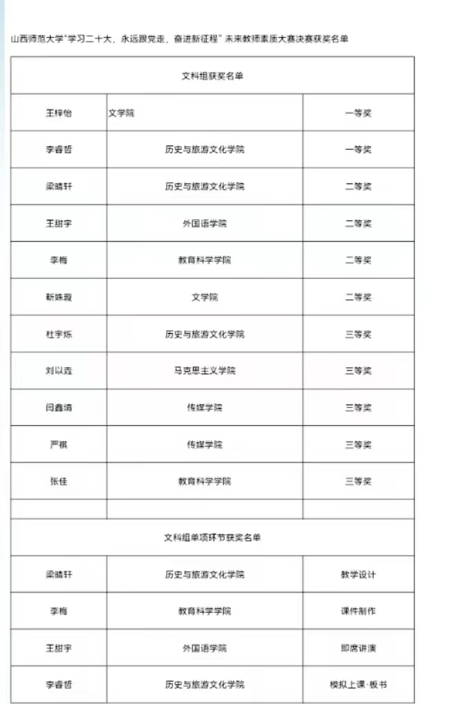 4月22日至23日,我校“学习二十大,永远跟党走,奋进新征程”未来教师素质大赛决赛在南区6号教学楼智慧教室举行。经过初赛、复赛、决赛的角逐,我院学子脱颖而出,喜创佳绩。其中,李睿哲同学获文科组一等奖,梁晴轩同学获文科组二等奖,杜宇烁同学获文科组三等奖。李睿哲、梁晴轩分别获得“模拟上课•板书”、“教学设计”环节单项奖。