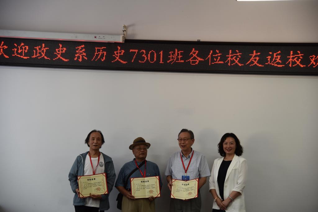 王玮向各位校友介绍了历史学院近年来的发展状况,代表学院接受了校友捐赠的图书。虽已鬓染银霜但依旧精神矍铄的校友们在交流会上深情回忆了在母校学习、生活、奋斗的大学时光,分享了时隔多年再度回到母校重聚的喜悦心情,表达了对母校对恩师的感恩之情,同时也对有这样的机会在母校团聚感到激动,为学院近年来的快速发展和所获成绩感到无比自豪,衷心祝愿母校蓬勃发展、再创辉煌。