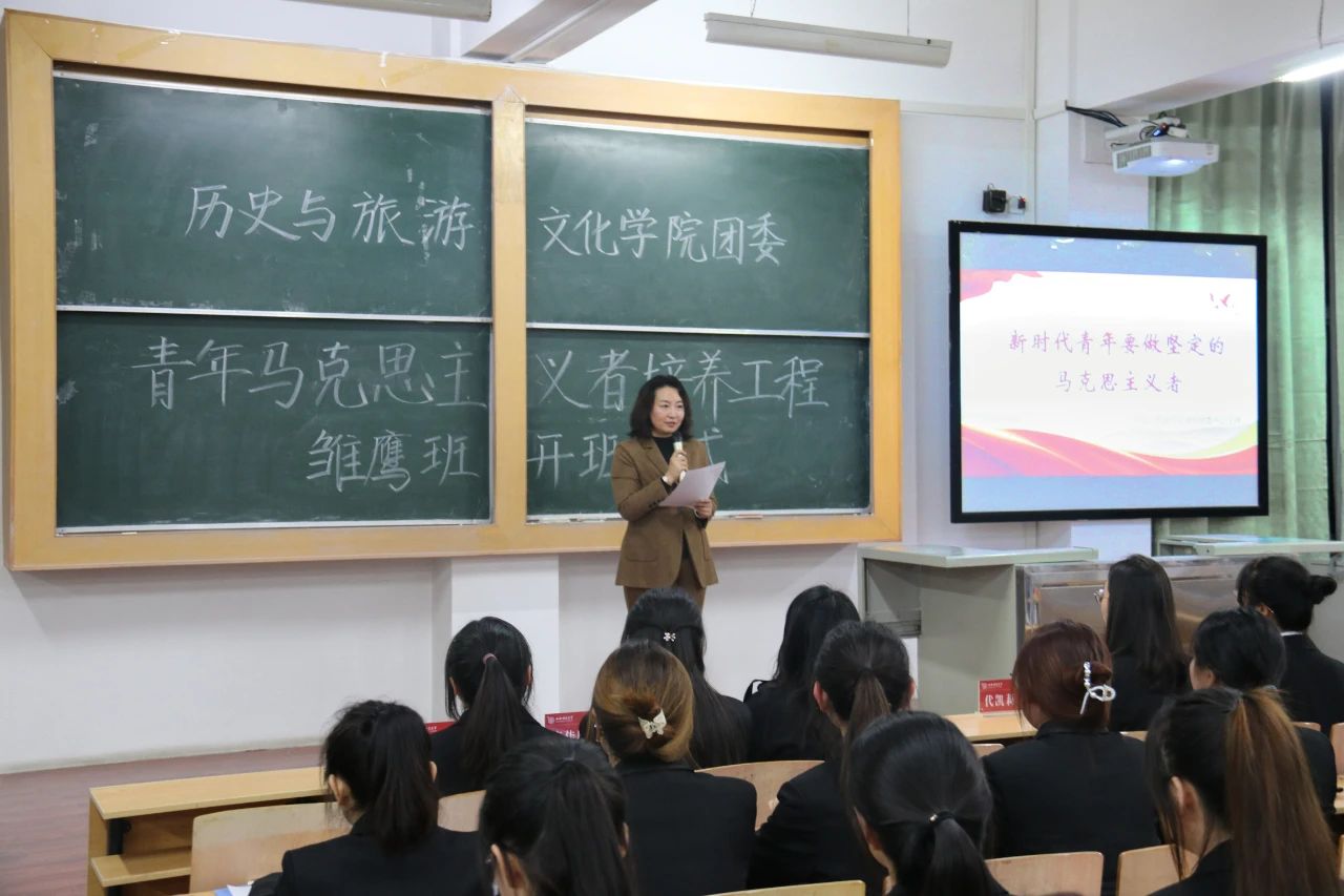 在激昂的团歌声中,开班仪式正式开始。院党委书记王玮老师做了题为“新时代青年要做坚定的马克思主义者”主题讲话。她指出青年信仰什么主义、捍卫什么主义,决定着国家和民族的前途命运。高校肩负着“为党育人、为国育才”的神圣使命,人才的核心要素是有坚定而正确的理想信念。她从坚定马克思主义信仰、自觉践行马克思主义理论、讲好马克思主义中国化故事三个方面教育引导同学们如何做一名青年马克思主义者。