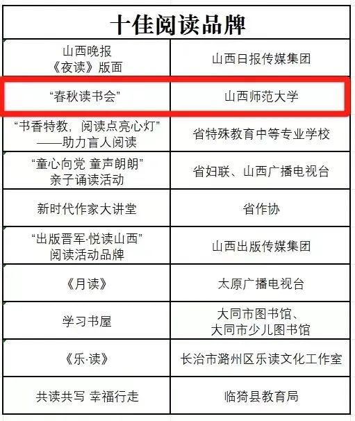 日前,“书香山西”全民阅读活动组委会对山西省2023年全民阅读系列推荐活动入选名单进行了公示,我院“春秋读书会”入选“十佳阅读品牌”。