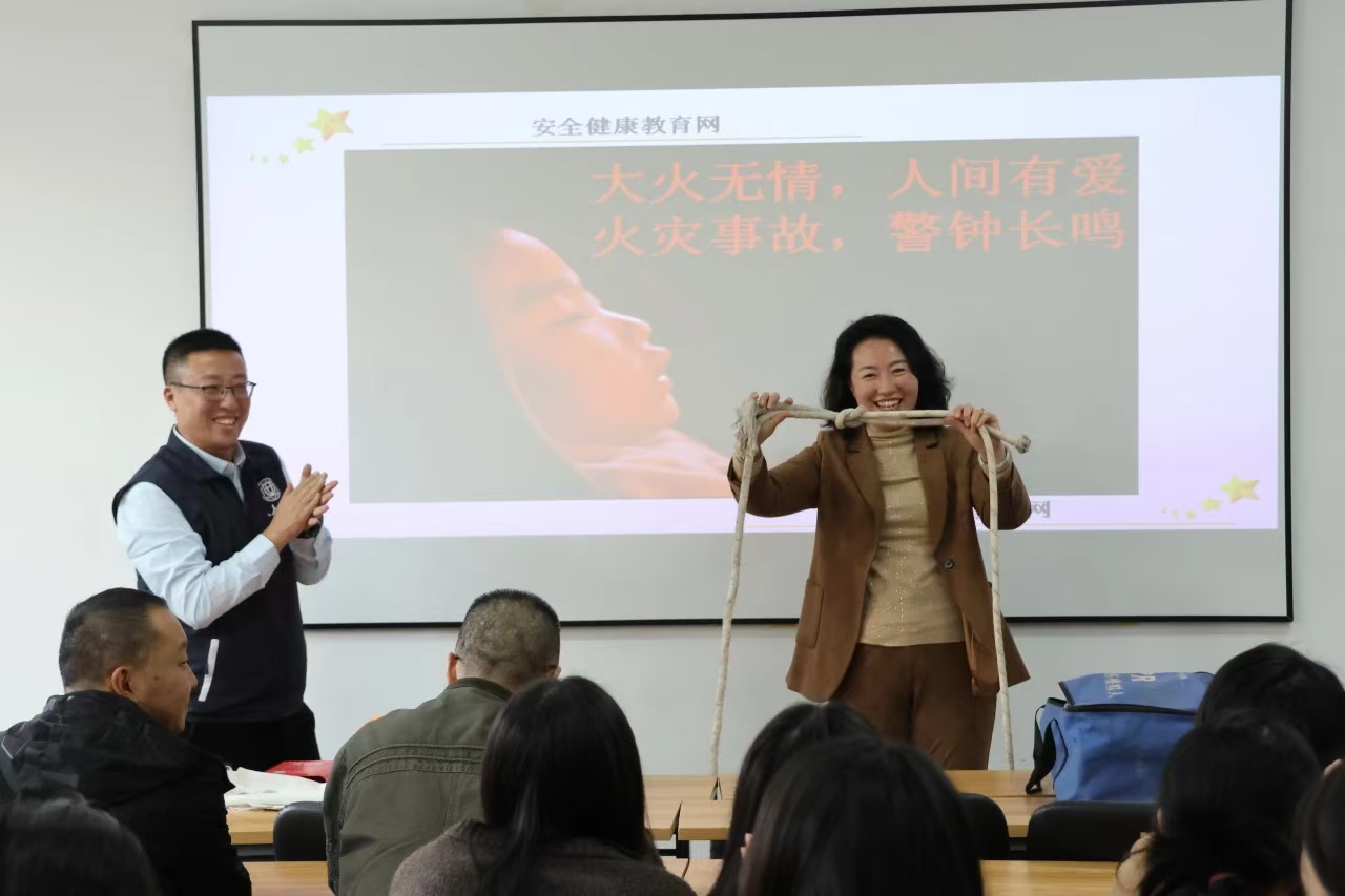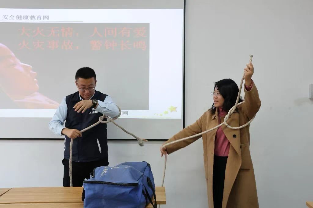 培训现场,李率老师结合近年来火灾的数据及案例,深入浅出地讲解了火灾的成因、危害以及预防措施。他现场向师生展示了灭火毯、防毒面具、灭火器、灭火贴等灭火用具的使用方法,教给大家在火灾现场快速逃生的方法。此外,李率老师还教授了节结和双平结两种打结方法,以及如何进行正确的心肺复苏的方法。活动现场师生认真学习、积极互动,受益匪浅。