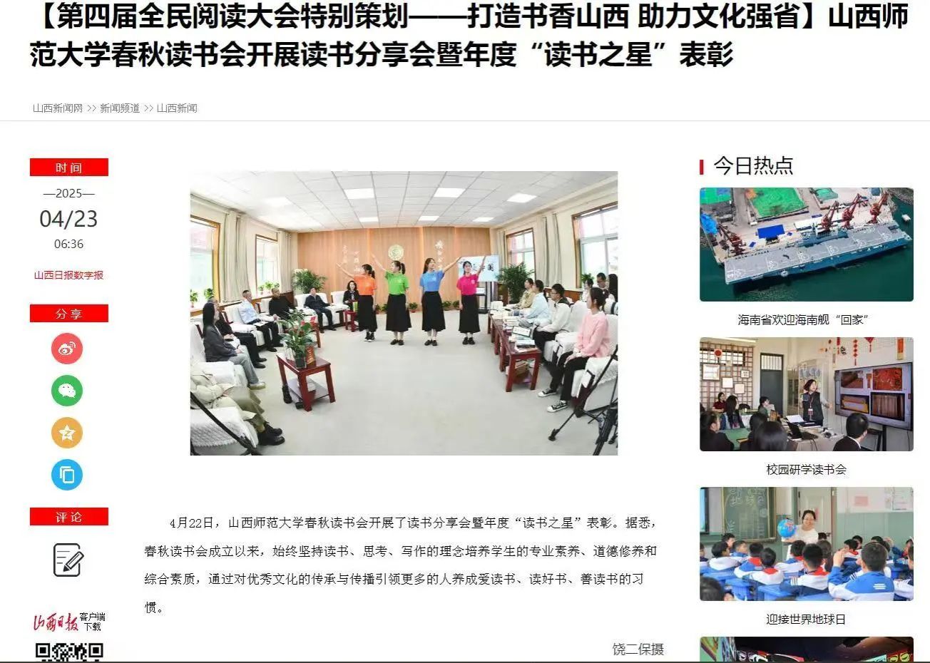 最是书香能致远,不负春光好读书。在第30个“世界读书日”到来之际,4月22日上午,“青春,如阅而至”——春秋读书会年度读书分享会暨2025年度“读书之星”表彰大会成功举办。校党委副书记王志强出席了分享会并讲话,校党委宣传部部长石斌、院党委书记王玮、院长侯慧明及部分读书会师生参加了分享会。分享会由院党委书记王玮主持。
