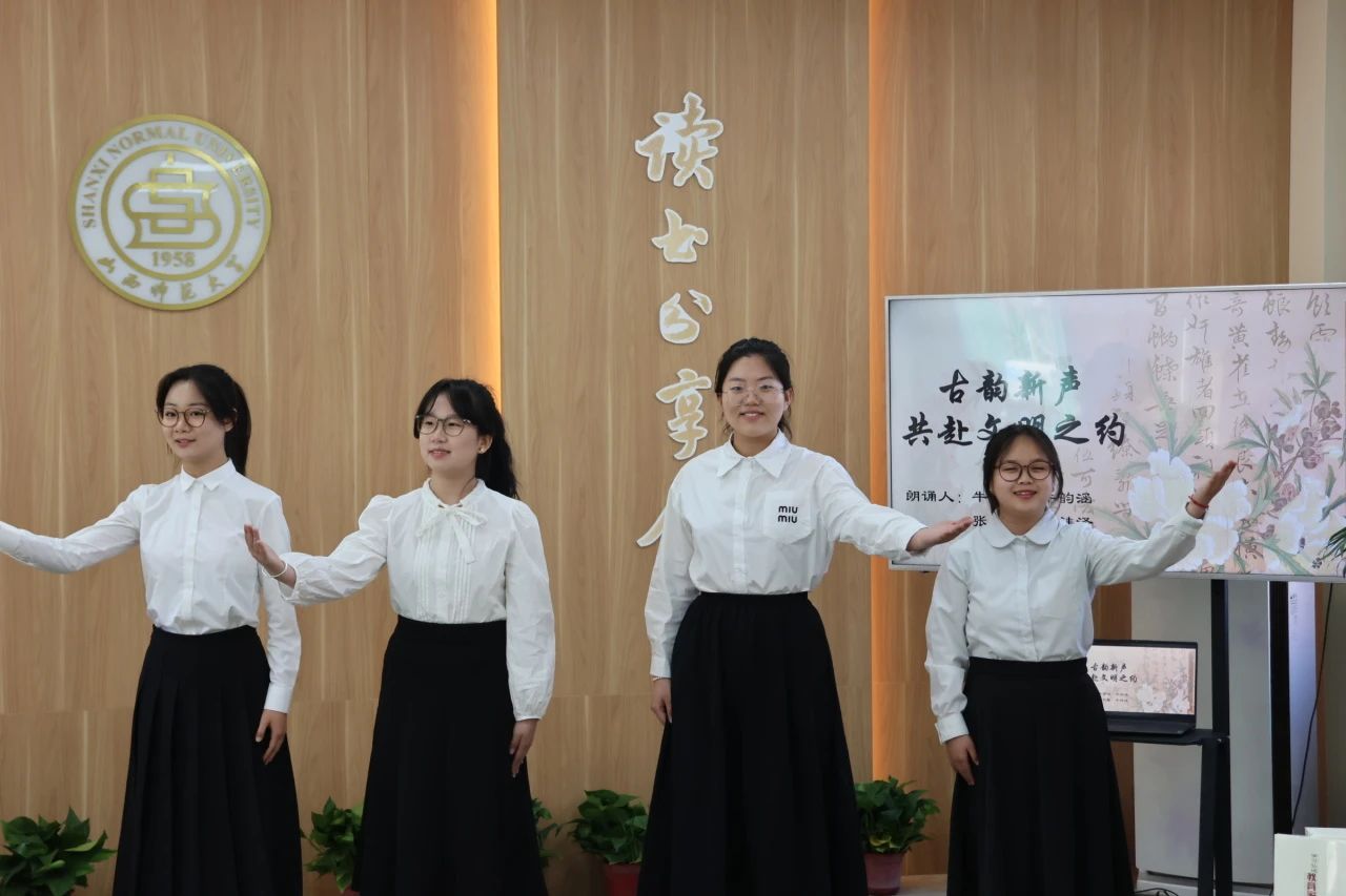 活动中,李晨雨、樊浩田、平安琪等三位同学通过讲书的方式交流分享了读书心得,带领大家从《万古江河》中领略文明的生命力,从《全球通史》中感受历史的波澜壮阔,从《文化苦旅》中体悟人生之旅的千奇百态。张云馨等同学带来的原创作品朗诵《古韵新声,共赴文明之约》和杨雪等同学带来经典作品朗诵《诗意中国》,用真挚饱满的情感和铿锵有力的声音带领现场师生回望历史、感悟时代,感受诵读的音韵之美、节奏之美、气势之美。