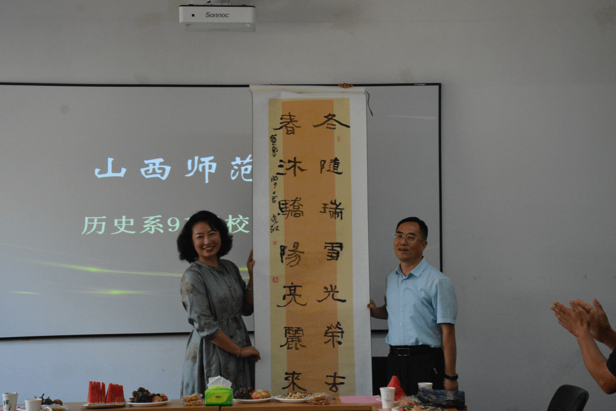 校友代表上官建红在热情洋溢的发言中对母校曾经的栽培表示深深的感谢,为母校和学院不断的发展壮大感到欣慰与自豪,同时还表示会永远以师大人的身份关注和支持学校发展。校友们也一一深情回忆了在师大学习、生活、奋斗的难忘时光,分享了时隔多年再度回到母校重聚的喜悦心情,表达了对母校、对恩师的感恩之情,衷心祝愿母校蓬勃发展、再创辉煌。王玮书记代表学院接受了校友捐赠的书法作品,并向每位校友回赠了学院教师出版的丛书。