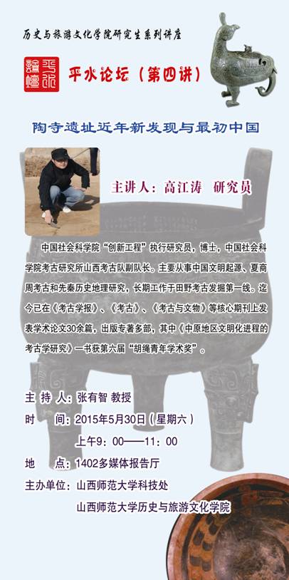 2015年5月30日上午,我院邀请中国社科院院考古所高江涛研究员作新葡的京集团8814研究生系列讲座“平水论坛”第四场报告。本场报告由副院长张焕君教授主持,一、二年级的研究生和相关专业的教师参加,主题为《陶寺遗址近年新发现与中国初期国家的形成》。