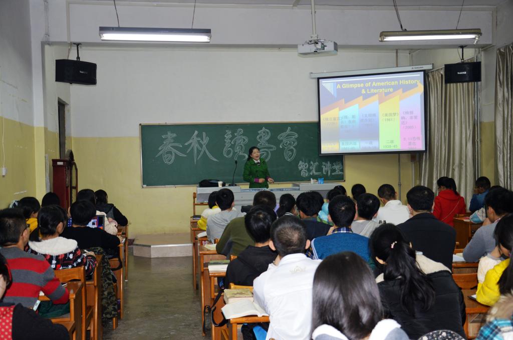 2015年11月15日晚,春秋读书会“智·汇讲堂”迎来了第五位主讲者,山西师范大学外国语学院的孔瑞老师。孔瑞老师毕业于北京大学英美文学专业(硕士),曾在美国威斯康星大学做访问学者。这次,她带来了题为“文学中的历史与历史中的文学——美国历史和文学一瞥”的讲座。讲座由王志超老师主持,7点30分准时开始。