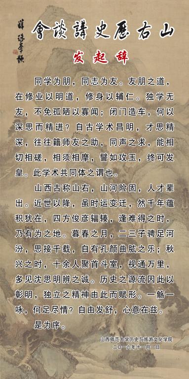 山西古称山右,山河险固,人才辈出。近世以降,虽时运变迁,然千年蕴积犹在,四方俊彦辐辏,逢难得之时,乃有为之地。暮春之月,二三子骋足河汾,思接千载,自有孔颜曲肱之乐;秋兴之时,十余人聚首斗室,视通万里,多见沈思明辨之诚。历史之源流因此以彰明,独立之精神由此而赋形。一觞一咏,何足尽情?自由发舒,心意在兹。
