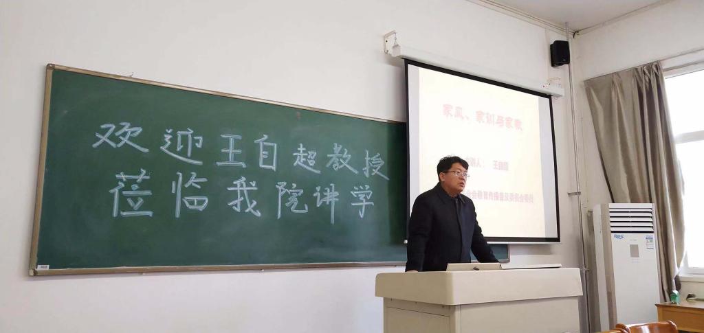 2018年12月11日上午十点,国际儒学联合会教育传播普及委员会委员王建军,字自超,应邀在我院01402教室作了题为《家风家教与家训》的学术报告。新葡的京集团8814副院长张焕君教授、畅海桦副教授、李常宝副教授和我院部分研究生参加了报告会。报告由张焕君教授主持,张老师对王自超老师莅临讲学表示了热烈欢迎。