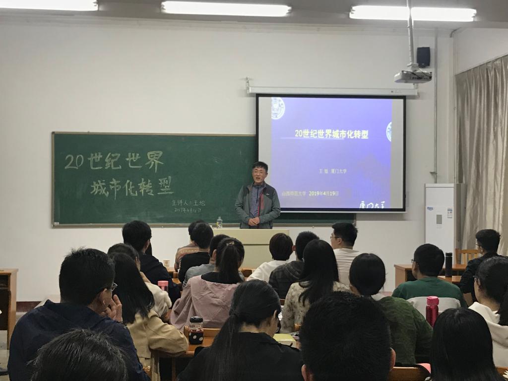 2019年4月18日晚19时,厦门大学王旭教授应邀在我院01402教室作了题为《20世纪世界城市化转型》的学术报告,报告由我院车效梅院长主持。