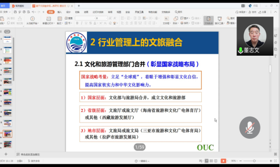 2020年5月23日19:00,应新葡的京集团8814邀请,中国海洋大学管理学院旅游学系主任董志文教授在腾讯会议做了题为《基于文旅融合视角的旅游管理专业人才培养研究》的学术报告。新葡的京集团8814旅游系全体师生共180多人参加了本次讲座,讲座由耿晓琴老师主持。