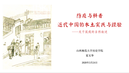 2020年5月24日下午15:00—17:30,我院夏文华老师以线上方式为我院师生作了题为《防疫与科普:近代中国的本土实践与经验》的报告。本次报告由谢耀亭老师主持,吸引了百余名学生共同在线聆听。