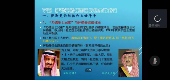 2020年5月28日19:00-20:40,西北大学中东研究所黄民兴教授应我院邀请在线上进行了题为《沙特阿拉伯的萨勒曼政治》的主题报告,报告由我院王霏副教授主持,在线师生达300人。