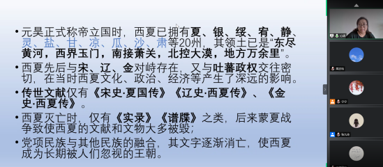2020年6月20日上午9:30至11:30,河北师范大学崔红芬教授应新葡的京集团8814邀请,作了一场题为“黑水城出土文献及其研究现状”的在线视频学术讲座,讲座由我院杨学勇教授主持,校内外师生共一百余人参加了此次讲座。